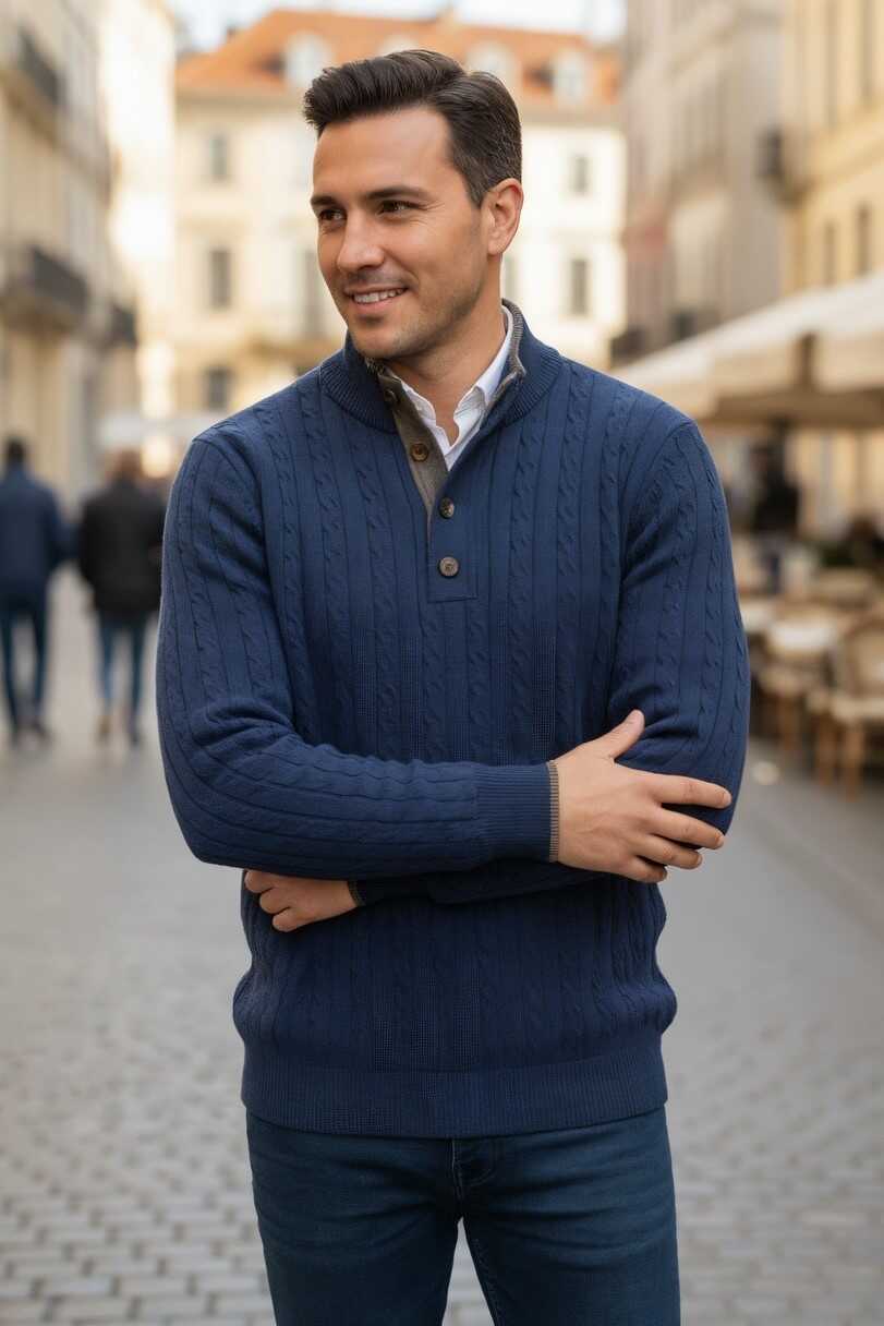 Ayon Lacivert Renk Düğmeli Yaka Saç Örgü Kaşmir Triko