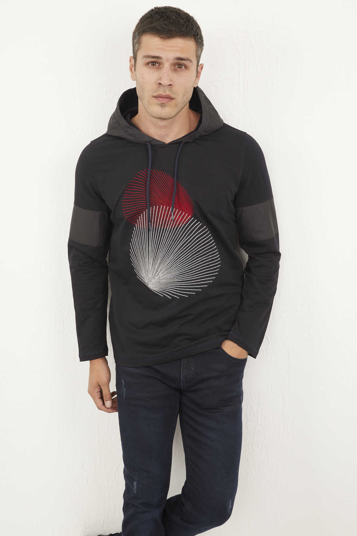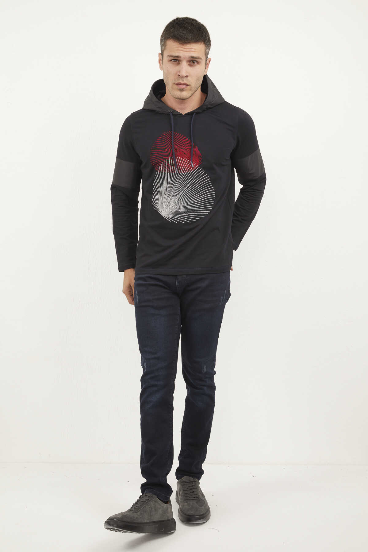 Kapüşonu ve kollardaki parçası farklı kumaş kullanılarak üretilmiştir. Baskıdaki grafik tasrım dikkat çekicidir.
