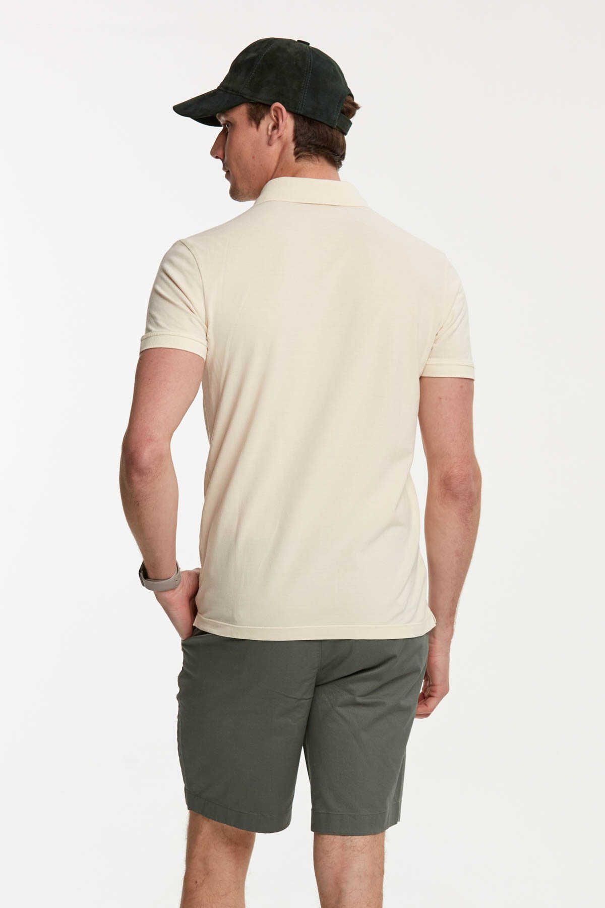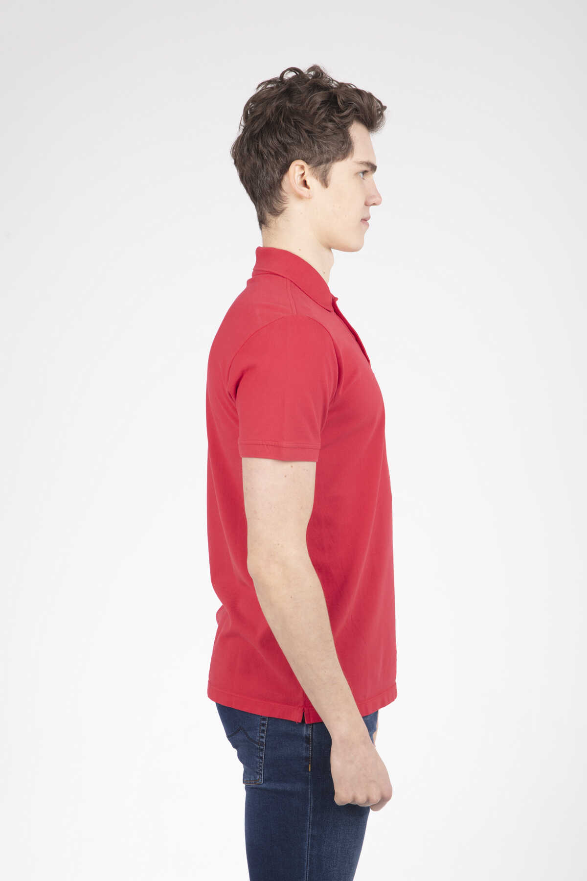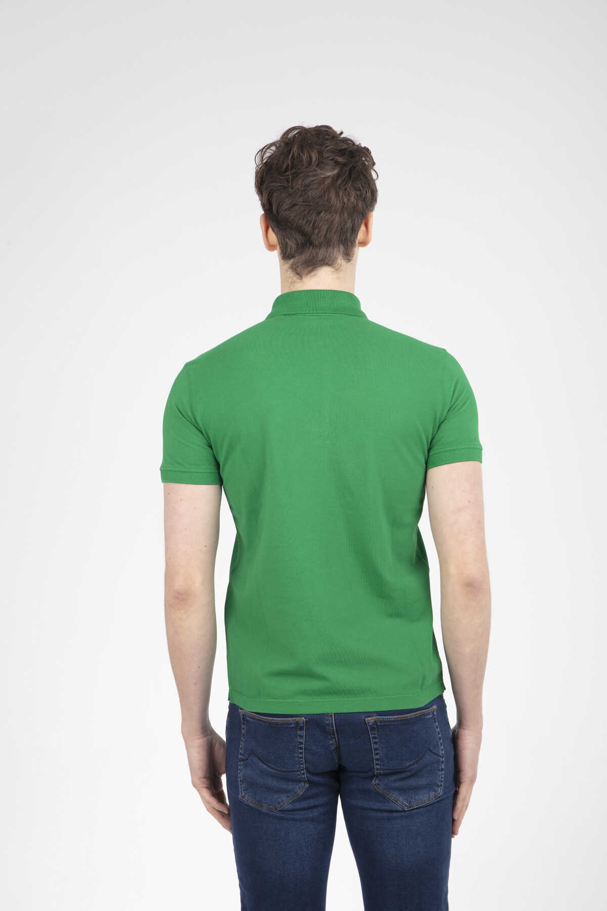Простая футболка из пике с воротником-поло. На планке должно быть две пуговицы.