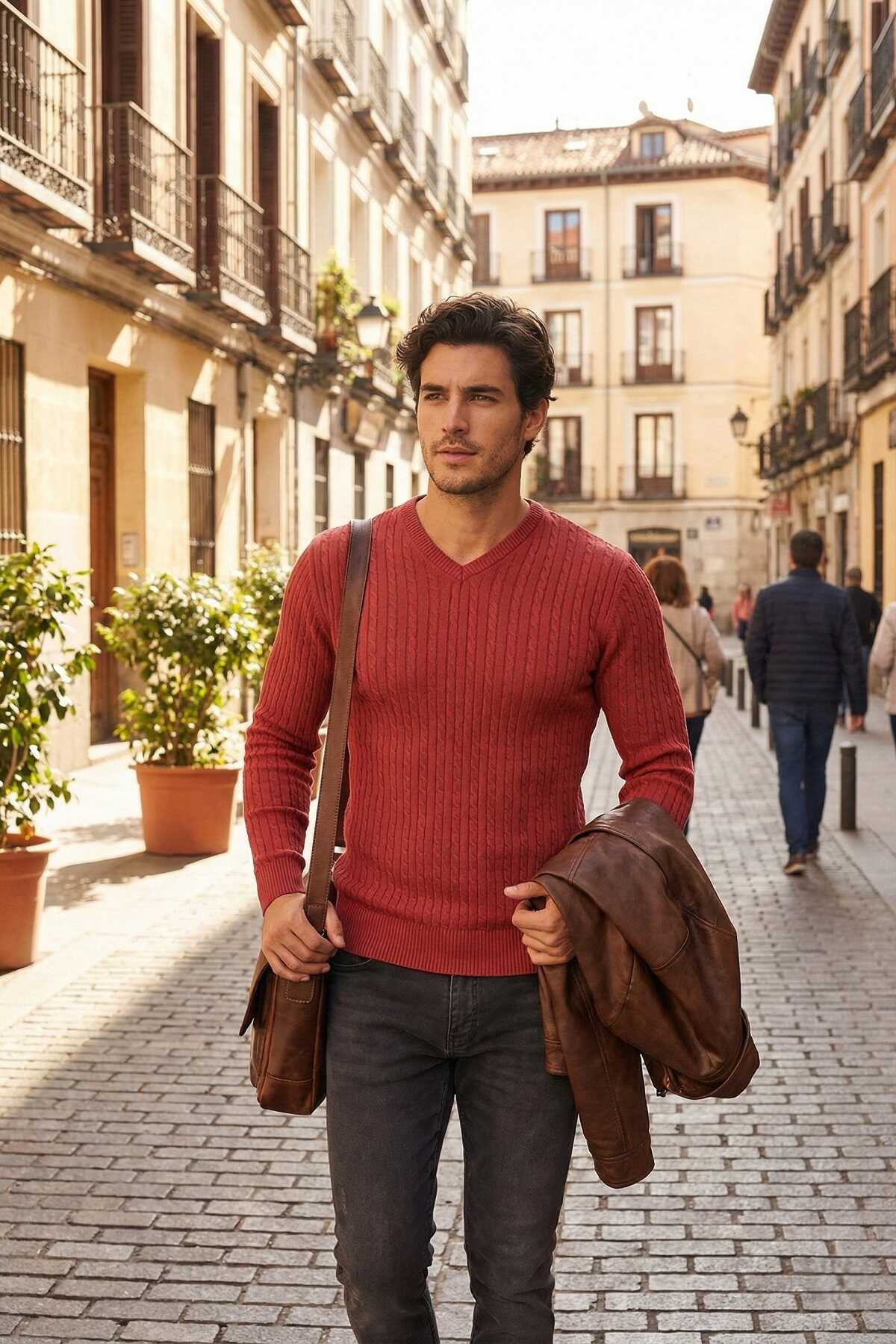 %100 Pamuk Saç Örgü V Yaka Pamuklu Parça Boya Triko Kazak