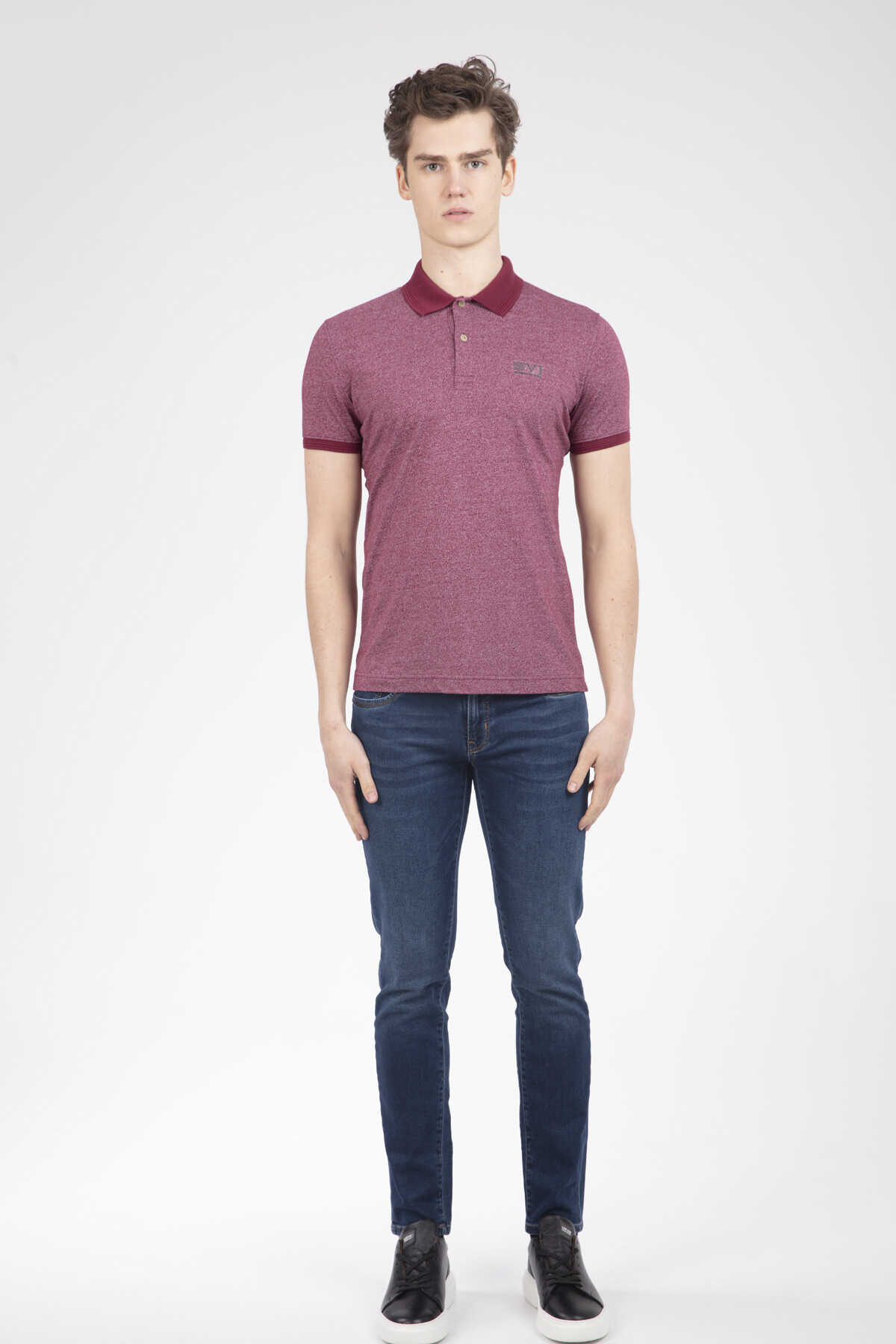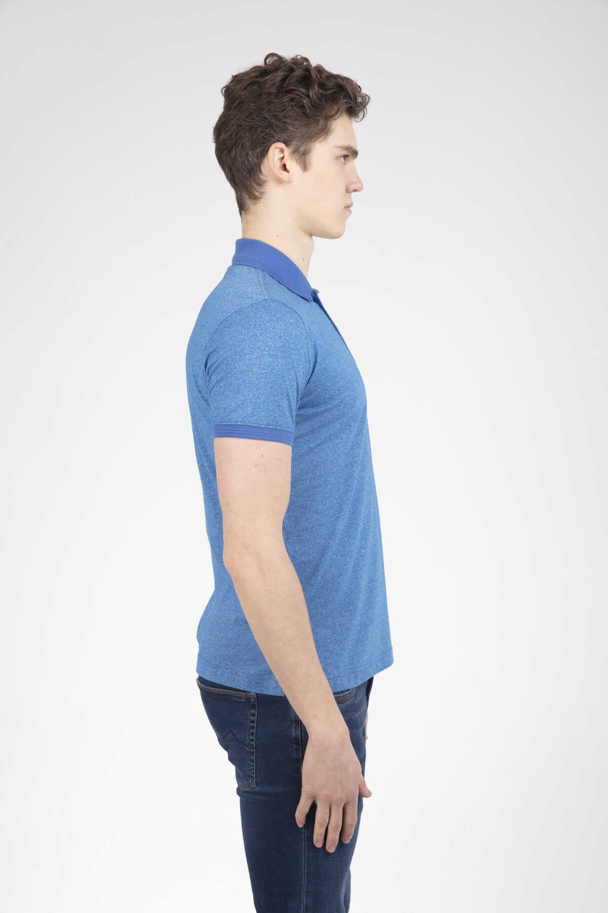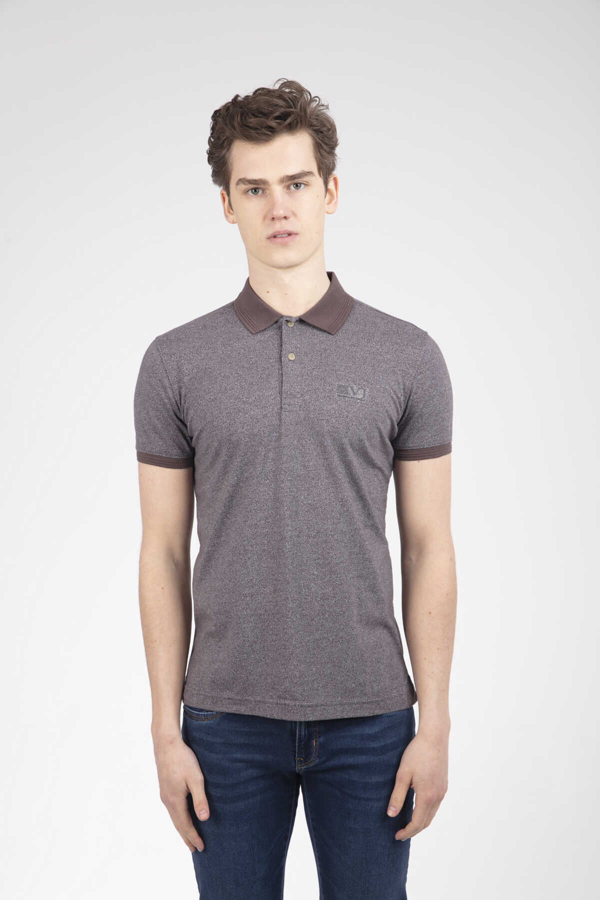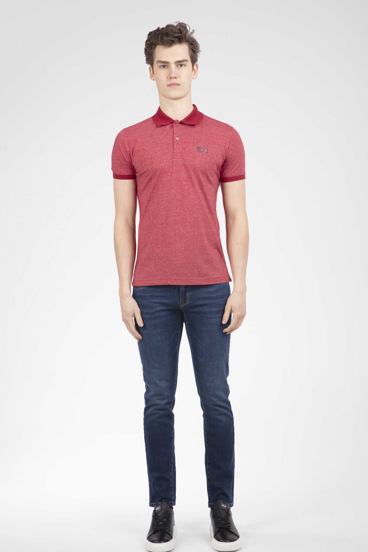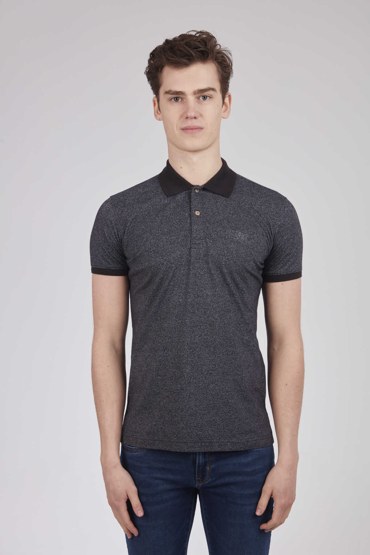 The product with different colors is produced from patterned fabric. It is a T-shirt that can be preferred by both sports and classic wearers.